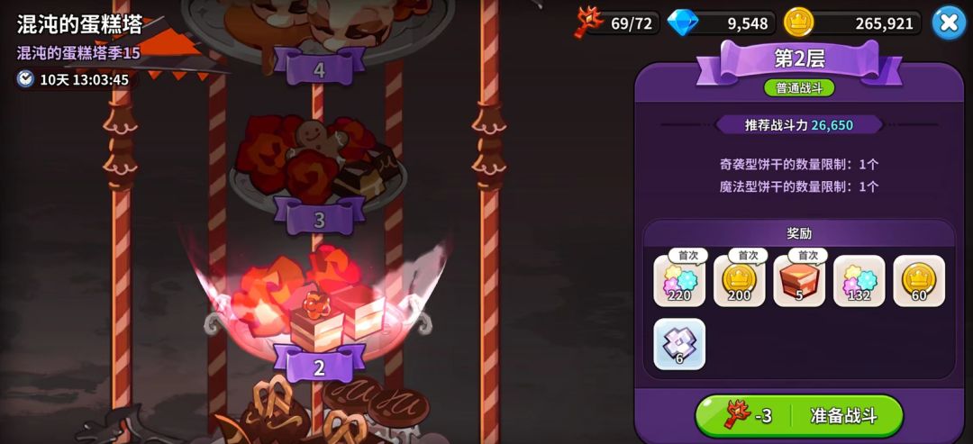 前期蛋糕塔层数多为某个类型饼干限制上阵1个,那么我们只要在限制内上阵饼干即可。并且由于蛋糕塔内只要通关就能领取全部奖励,因此不用考虑通关时饼干是否全部存活等问题。
