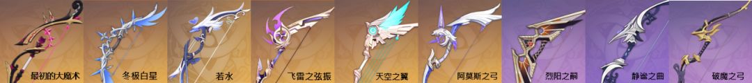 剩下三把四星弓箭,实际上的差距也并没有达到非选择某一把不可的地步。因此,四星弓箭在新纪行武器-烈阳之嗣、破魔之弓和枫丹新锻造武器-静谧之曲,这三把选择一把即可。