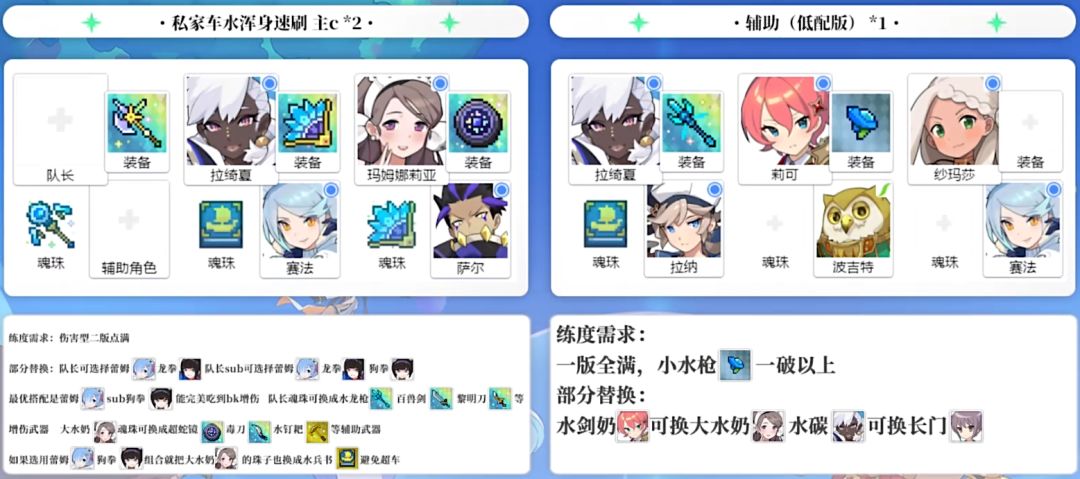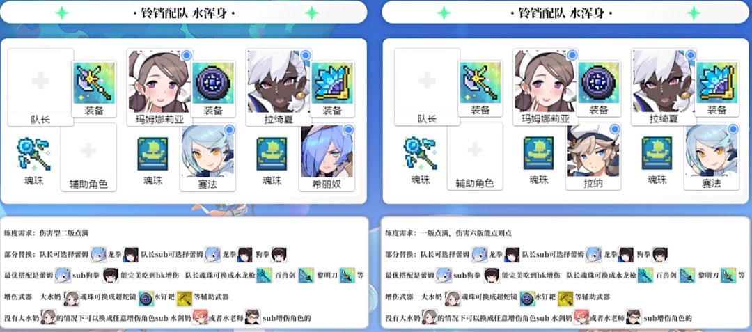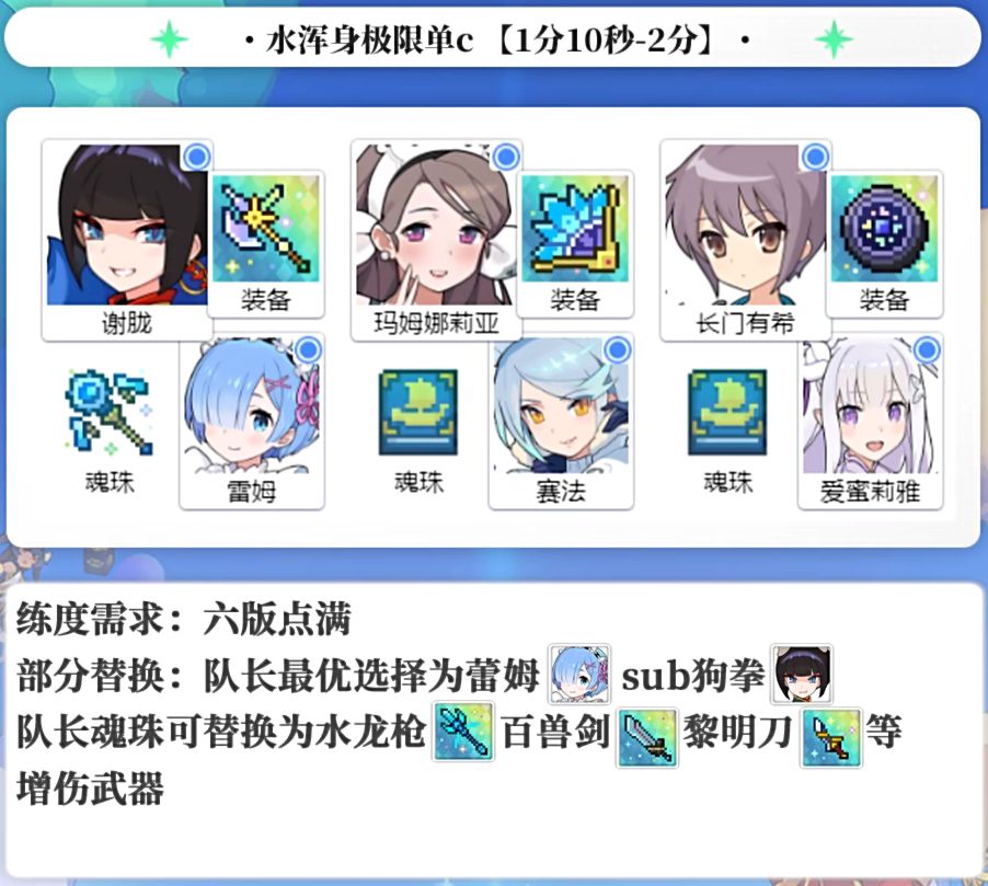 目前水浑身的队长位的主位和sub搭配多样,本次副本最优为蕾姆sub狗拳可以完美吃到bk增伤效果,但是需要注意如果是蕾姆sub狗拳的组合需要将大水奶的魂珠换为水兵书避免技能轴错乱。