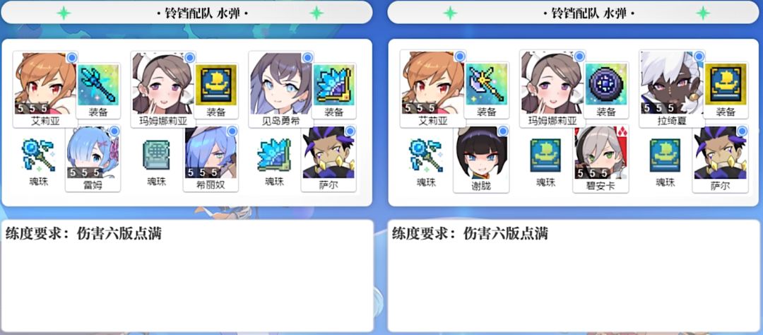 铃铛队伍的话相较于速刷则更需要注重生存能力了(不过有水大奶的队伍明显生存能力不差的),由于目前水属性其它体系仍旧处于“未来可欺”的的状态,所以铃铛方面依旧更推荐水技伤体系的相关队伍。