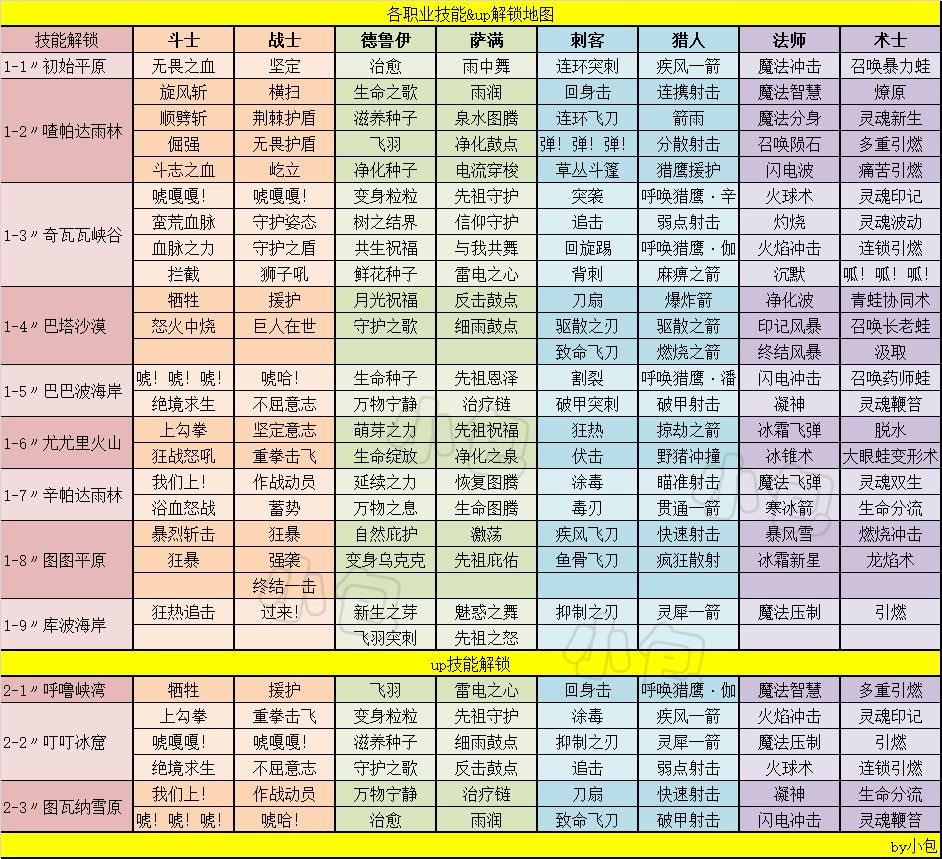 经过一夜的努力,终于把8大职业的所有技能及up解锁地点整理完毕。