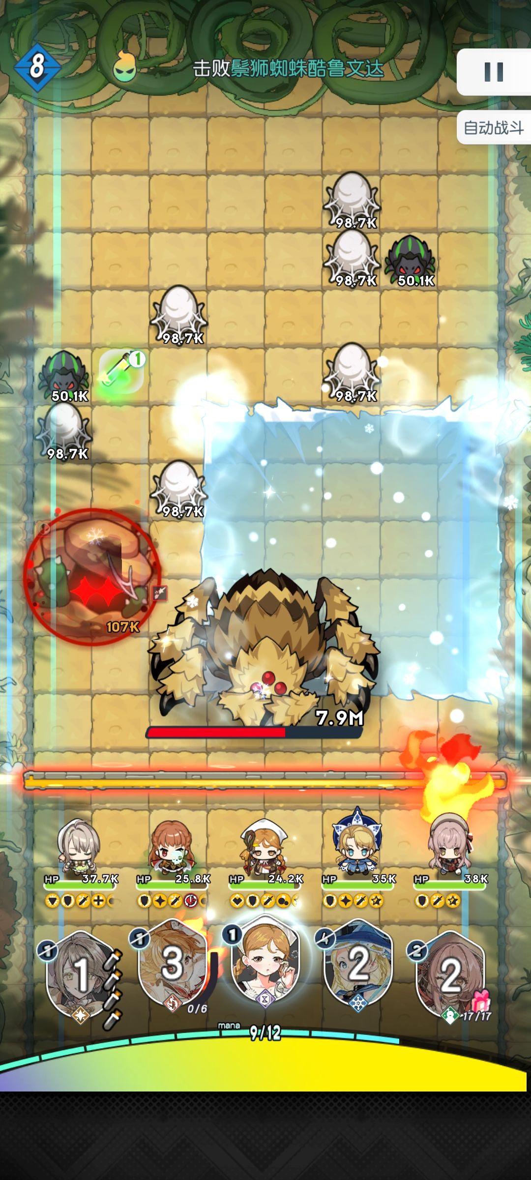 3.如何击杀刺客,这里有先决条件,在蜘蛛洞全部被打掉且这一轮击杀掉刺客或者刺客必须要被蜘蛛网缠住,要不然打完会钻进蜘蛛洞里(图3),两个回合后又会满血复活,如果让她钻洞了(图5),这里建议放弃,重新开始