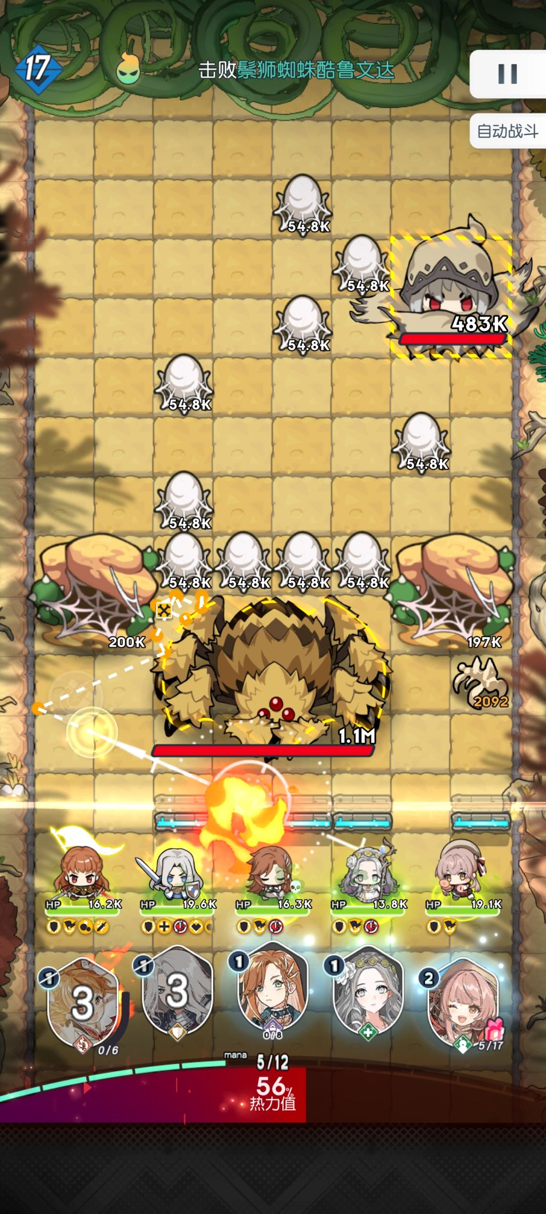boss关第一回合不要着急打伤害,先把第二排四个小怪清掉(很重要)等二回合boss近身开T和红帽技能,拉boss,巢穴,蜘蛛卵中间的三角区,打引爆伤害,boss后退时新小怪出现后用特蕾莎打出球位置的对角通道(左或者右第三列,如果有通道可以不用),直到boss用剩余小怪吸血再次拉进身,如此循环。