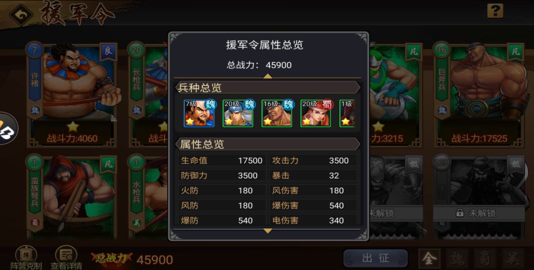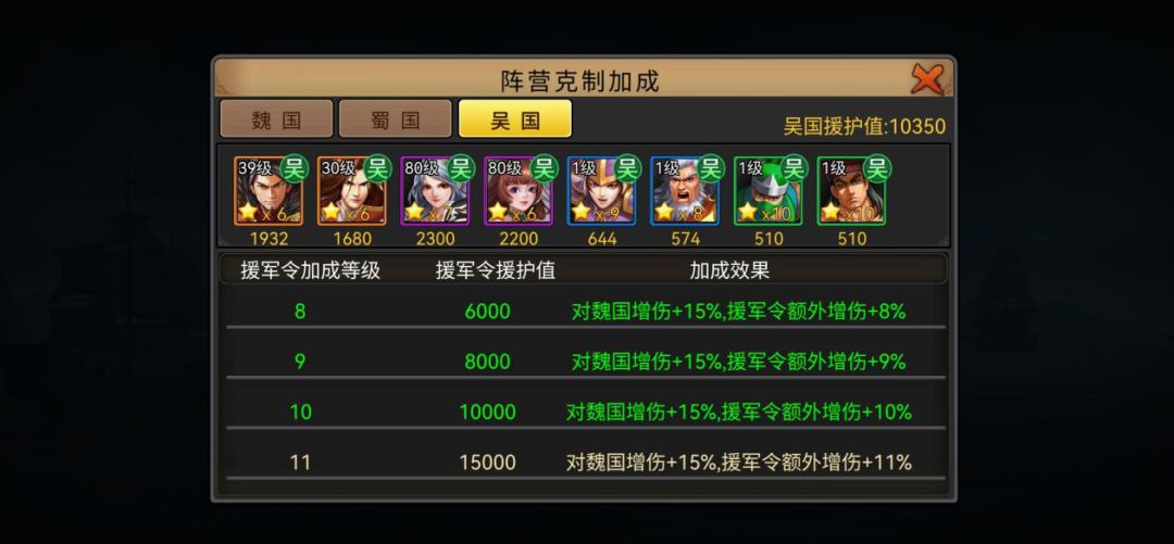 随着百战试炼天煞词缀和攻城略地阵营克制的铺开,新增的阵营克制关系也是副本提速的增幅器。援军克制增伤时造成额外增益伤害为:+15%+X%(X为援军令加成等级,上限20级),挑战攻城略地守关boss同属一个阵营时,造成伤害-30%受到伤害+30%。而援军令的克制加成和属性加成一致,一旦生成,就是永久赋予,不会受上不上阵影响,玩家只要做的是上阵克制本周攻城略地阵营的武将即可拥有援军令系统克制加成的总效果。