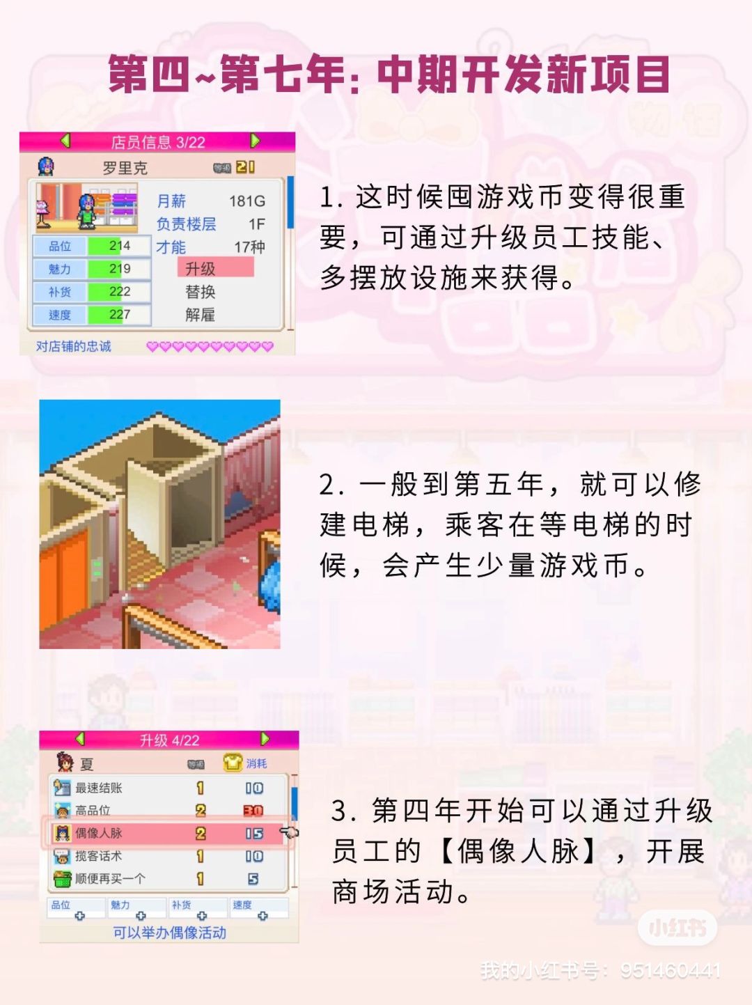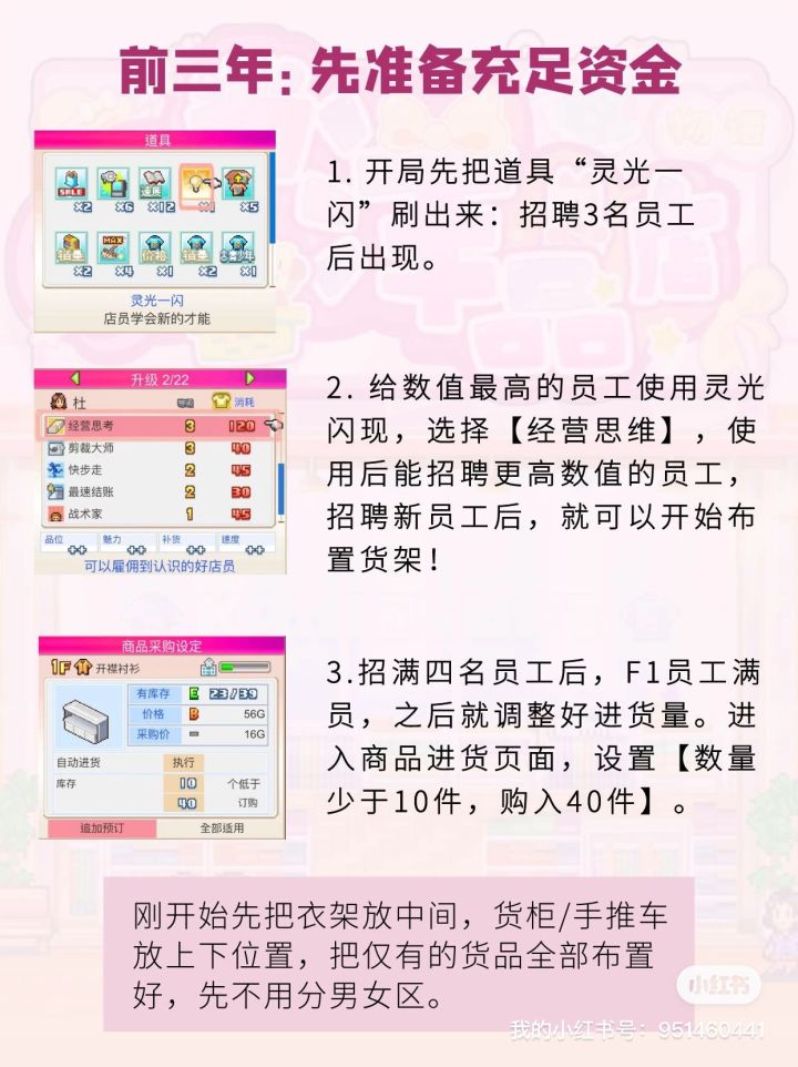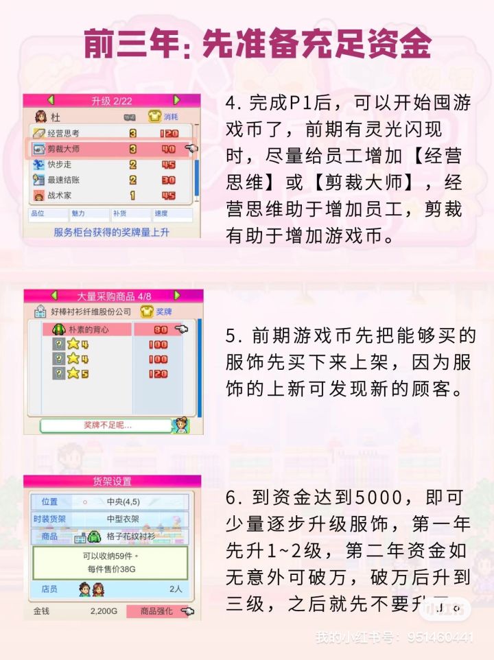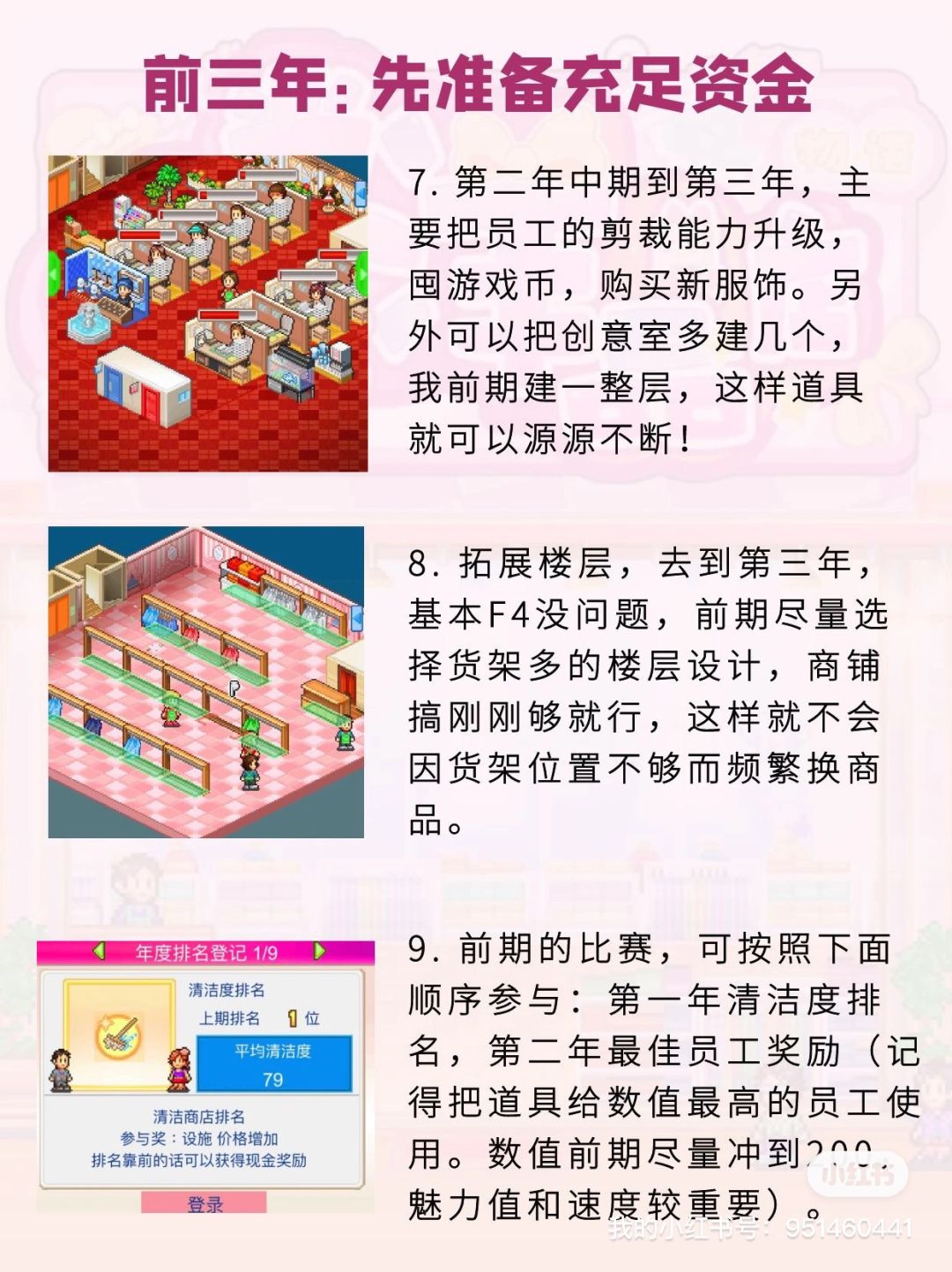 前期一样以赚钱为主,资金来源于客户层的开发和商品的开发,因此前三年都是围绕这两者开展。其中能快速囤资金的方法有以下几个:第一是销售商品(需要不断囤游戏币,前期不好搞);第二:升级员工技能,参加比赛,赛后拿奖金(这个好搞,看我前三年的比赛攻略);第三:用道具提高商品销量和价格,以及用好促销道具(前期可多建创作室,我自己做了一层都是创作室哈哈哈[大笑R])