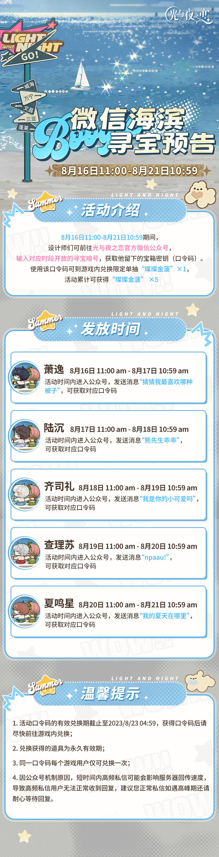 8月16日-8月21日,光与夜之恋微信公众号将每日解锁一个奖励密钥。