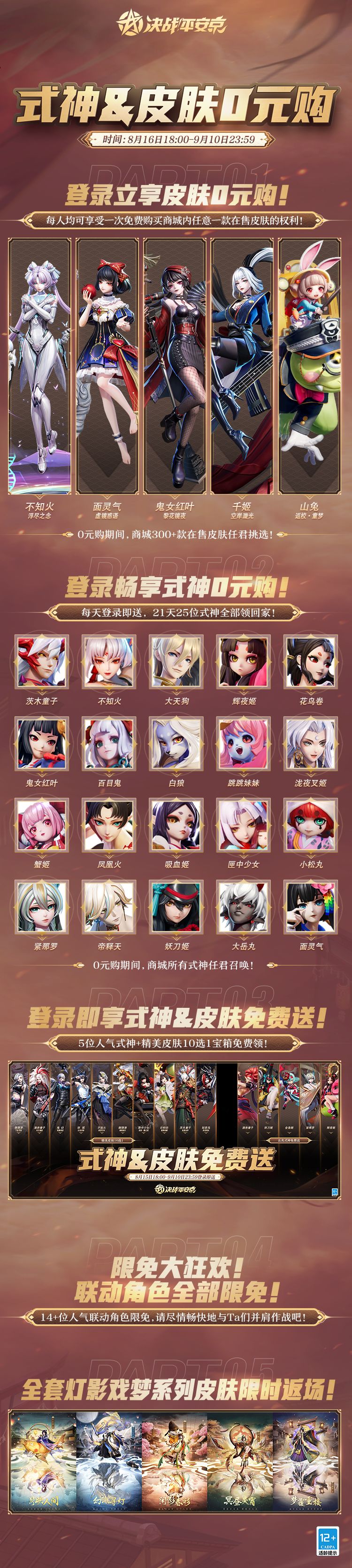 8月16日18:00-9月10日23:59期间首次登录《决战!平安京》的大人们均可一口气收到[式神0元商城“祈愿”券]*5,后续每天登录即可免费领取当天的[式神0元商城“祈愿”券]*1,商场在售所有式神角色随意挑选,心仪的式神角色0元带回家!活动期间,每位大人最多可领取[式神0元商城“祈愿”券]*25,[式神0元商城“祈愿”券]将通过邮件发放,请大人们记得每天上线及时领取使用哦~
