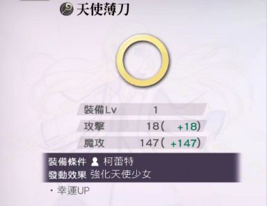 专武-天使薄刀:物攻/魔攻:18/147,幸运值+25 (不推荐日常使用,魔攻过低,新人可以用来过度)