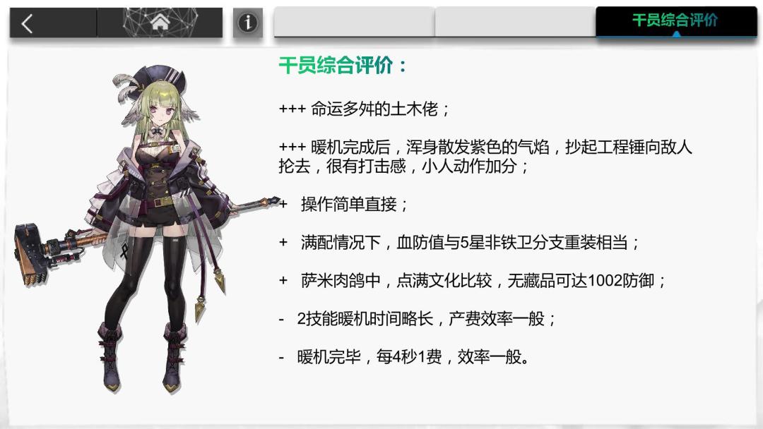 在不追求爆费的前提下,个人认为是个很扎实的选择,较适用于剿灭等持续较长时间,产费压力不大的地图。