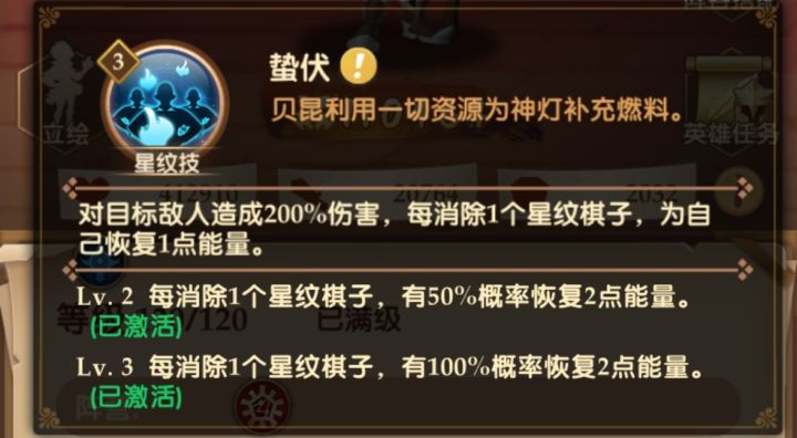 3、星纹技能:蛰伏。消除一个星纹,回复2点能量,全游戏中独一无二的设计。看起来不多,但是与其他英雄星纹只回复1点能量的设定来说,已经非常好了。而且消消英雄的一个设定是:手动消除一个星纹,战斗中视为发动两个星纹!请让我再次重复非常重要的这句话(也是给萌新们补课):手动消除一个星纹,战斗中视为发动两个星纹!这样说来,如果我三消了一个蓝色的星纹棋子,贝昆要回复几点能量?七点!!具体是:三消3点+星纹2点+星纹2点。这样想起来,贝昆的这个星纹技能是否强的可怕?我在实战中总是不会不觉贝昆能量就满了。