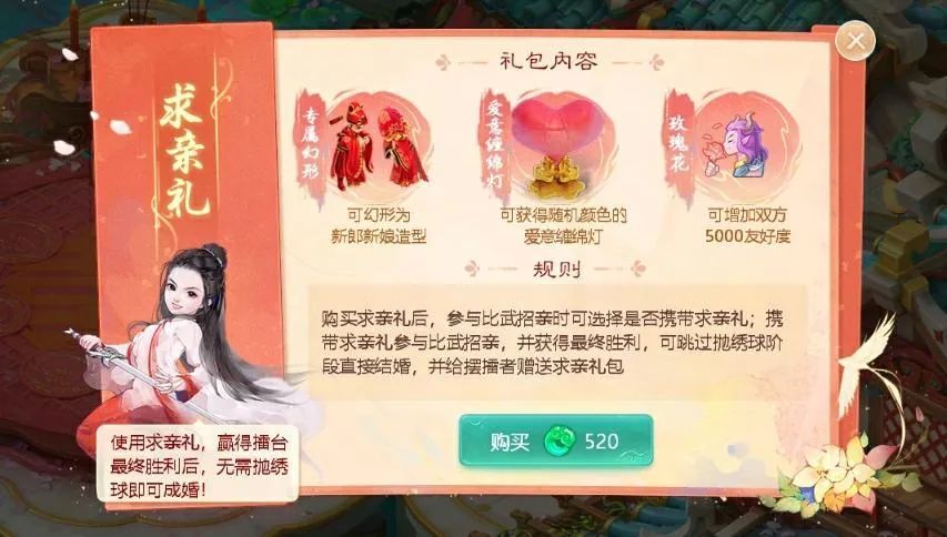 参与比武招亲时,可预先购买“求亲礼”;使用后,如果赢得擂台最终胜利,可跳过抛绣球阶段直接成婚!而摆擂少侠也将会收到爱意满满的求亲礼包哦~