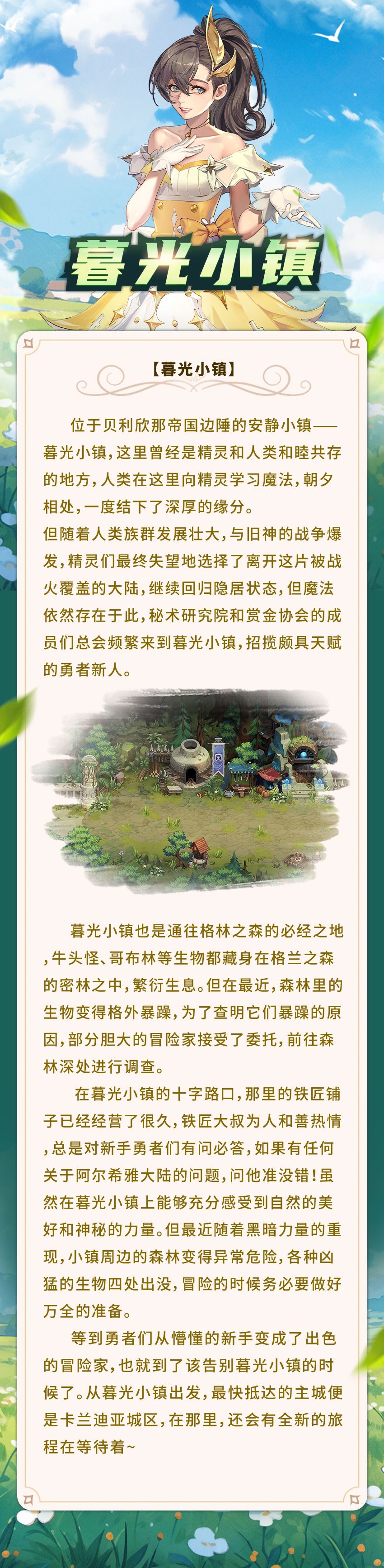 今天,咩咩罐将带领大家探索贝利欣娜帝国边陲的安静小镇——暮光小镇,这个地方因宁静和魔法而赫赫有名,每当夕阳西下的时候,暮光小镇都会向世人展现出宛如童话般的美丽景色,冒险家们千万不要错过哦~
