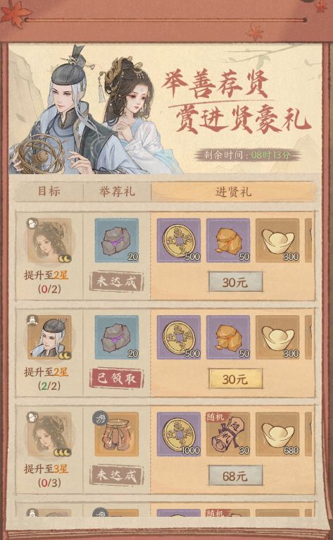 城主们还可购买相应的超值进贤礼包(内含沈珍珠、李淳风、招贤通宝、元宝、爵位经验等),助力培养新僚属!