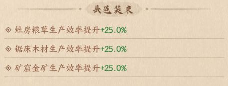 解锁「戎马倥惚」装束后灶房、锯床、矿窑(粮草、木材、金矿)可立即获得25%的生产效率强力加成,助力大人获得更高收益!