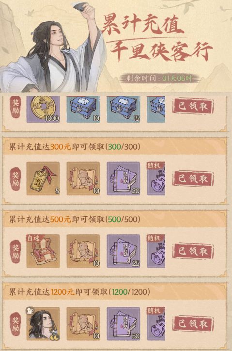 限时累充福利活动开启!累计充值达指定档位即可获得李白「侠客行」皮肤、新县邑装束「戎马倥惚」、招贤令等其他丰厚奖励!
