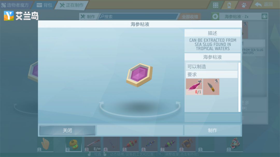 海参粘液要从热带岛屿附近的海域先找到海参,然后加上一把锤子才能制作出来,锤子是岛主们经常制作的,只需要石头+木棍+绳子就可以合成了。