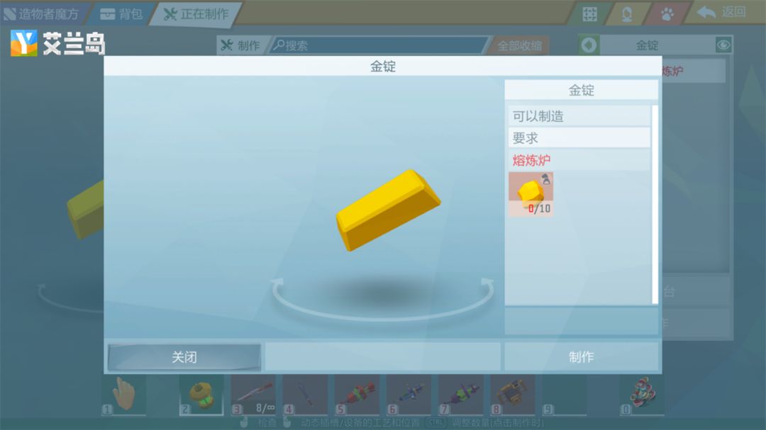 用两种方法解锁配方后,岛主们也要知道相关的材料如何获取才行!可以看到,遗迹钥匙的配方需要金锭*1+大袍子*2+恶魔的牙齿*1+海参粘液*1+石锤*1才能制作,其中金锭需要10颗金矿石,而大袍子岛主们则可以在岛屿上找到。