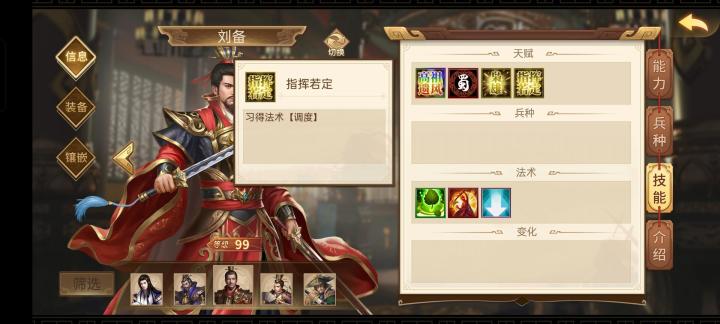 话不多说,首先介绍下刘备的各类特色技能:调度(炼狱界桥之战难度7全灭敌军且我军不死一人过关获得)和枭雄(商场10元宝直接购买获得)。