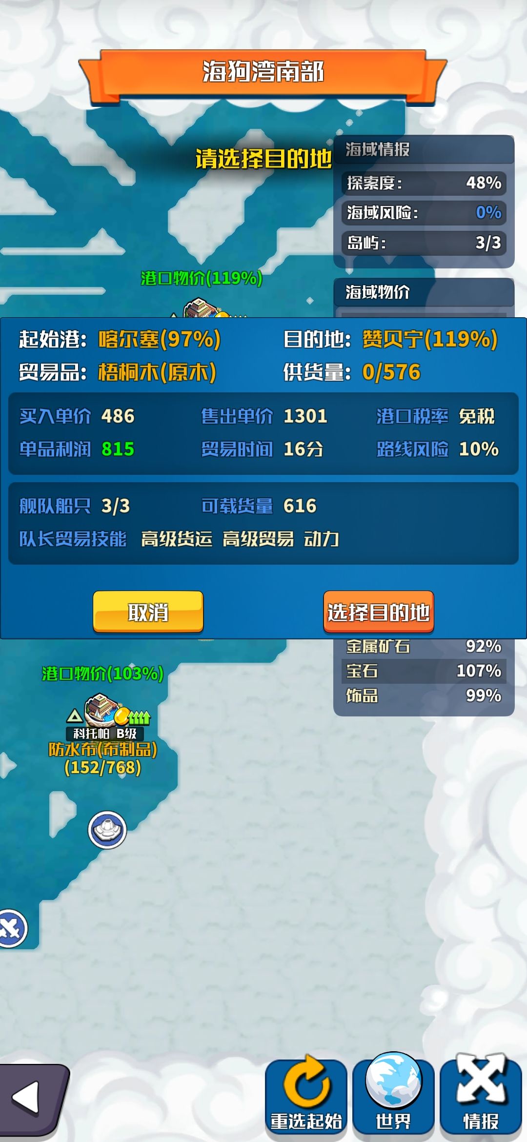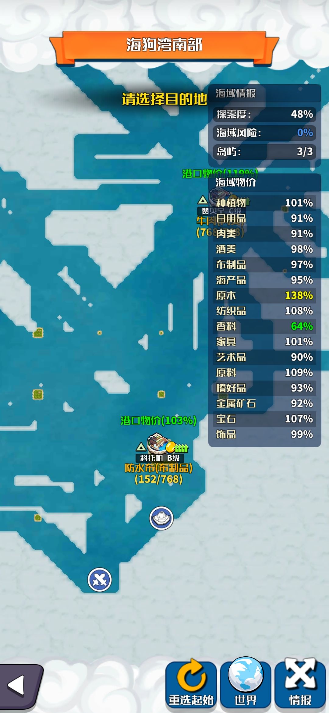 本作跑商不用手动跑了,哄抬物价也没了,所以想要利润高就要找到单品高的商品,投资市场增加每半年的补货数量,每片海域的市场行情可以在市场花点钱就可以买到了,比如我的海狗西南有梧桐木,海狗南的原木比例138%,就可以多卖很多钱。