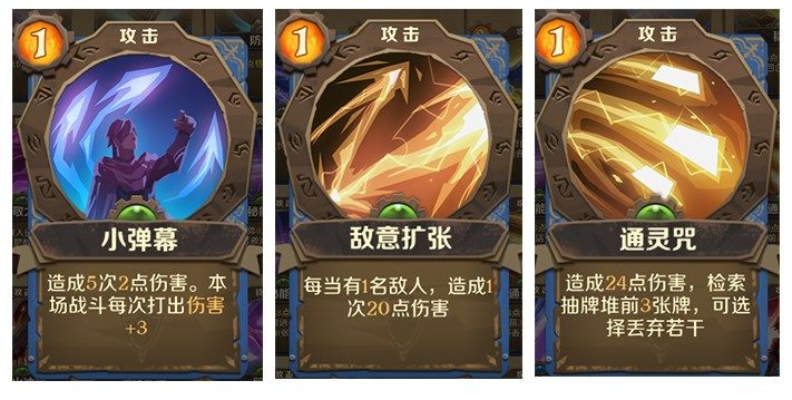 同时“小弹幕”、“敌意扩张”和“通灵咒”,都是非常优质的低品质攻击牌,获取难度较低,可以用来替换掉初始攻击,提升伤害upup