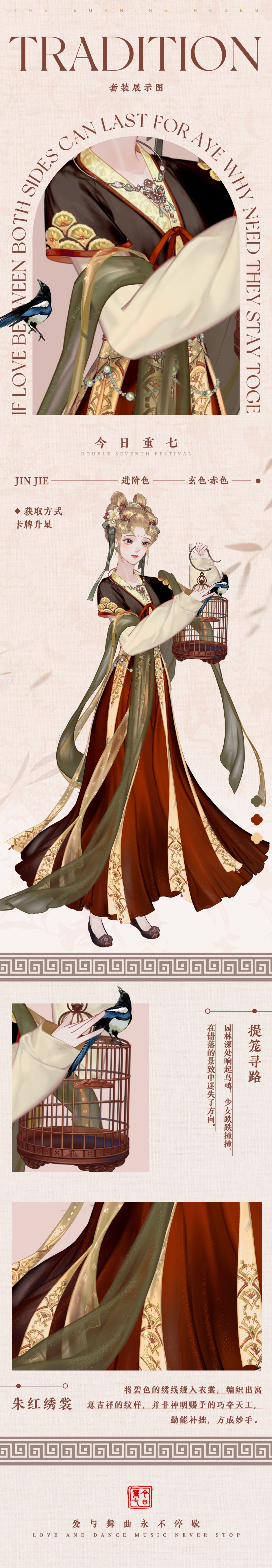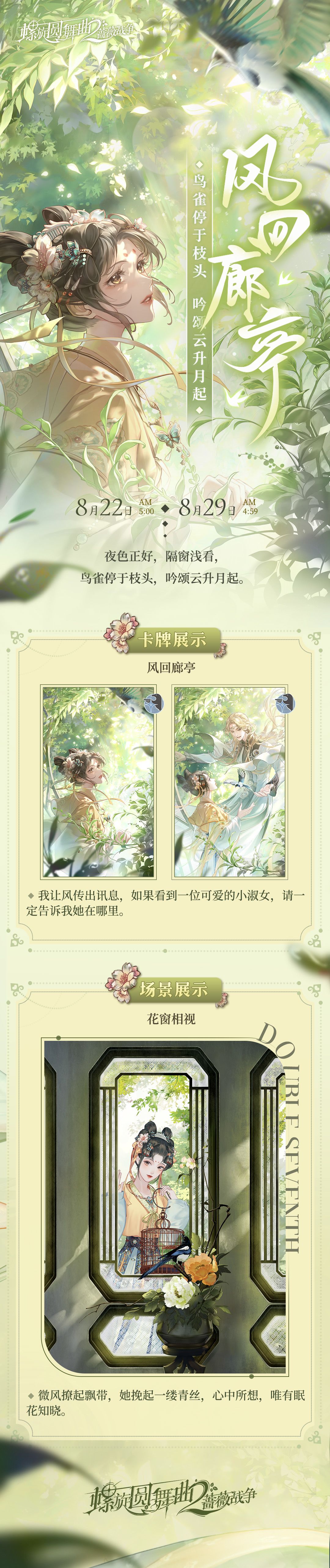 8月22日5:00-8月30日4:59,使用灵鹊勋章可在「商人·马歇尔商盟」处换购限定套装【今日重七】、限定卡牌【风回廊亭】及多种资源道具奖励。