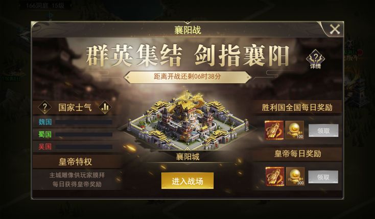 1. 襄阳战这个活动从开服第七天开始第一轮,以后每隔七天打一次。襄阳战的大奖是皇帝头衔,除了皇帝头衔以外,还有一大堆的排名奖和参与奖。基本上只要进去打几下就能拿到不少突破丹、经验书。打赢的国家全国还可以连续7天领取大量的奖励,绝对是个大家乐的活动。