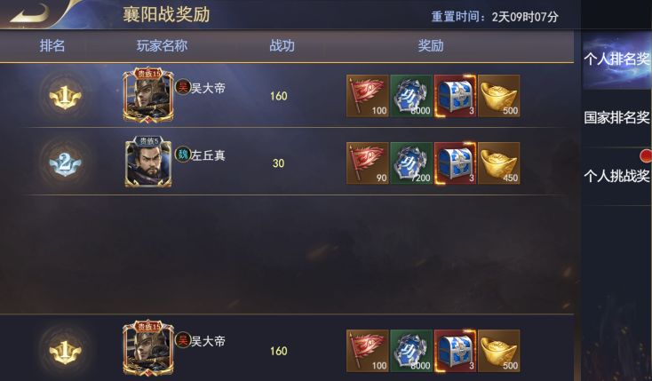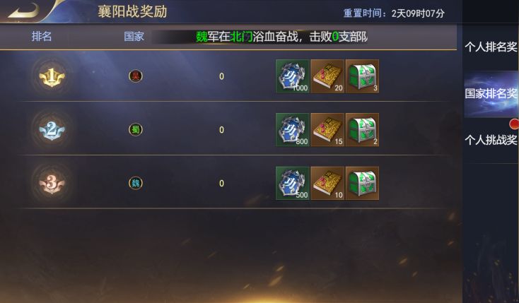 7. 这个玩法的奖励超级多,排名奖,国家奖,个人奖,三个奖叠加在一起拿到手软。笔者发现个人奖还有个可以刷的漏洞。因为个人奖是只计算战斗场次的,所以还可以派个低级武将1个人带一点兵上去撞。撞完就可以拿个人挑战奖励了。
