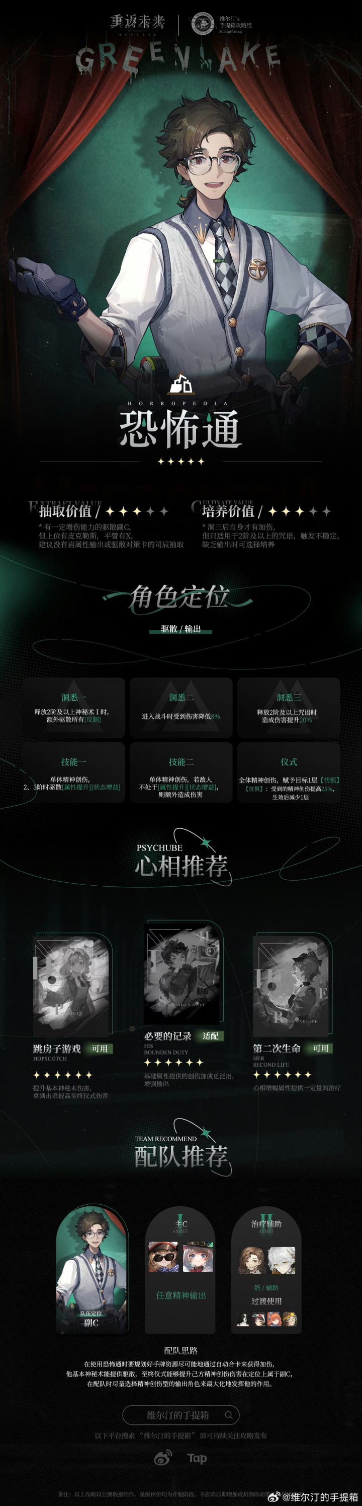 角色一图流内容包括:角色评级、配队思路及推荐、心相推荐、认真看完一图流,各位司辰们就可以对恐怖通的玩法有一个大致的思路。