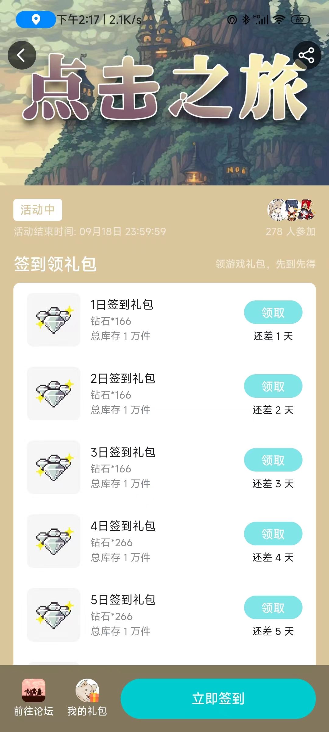 在TapTap中,点击我的游戏,游戏库找到《点击之旅》,下边就有签到福利啦,点击进入就能领取,总共七天哟~