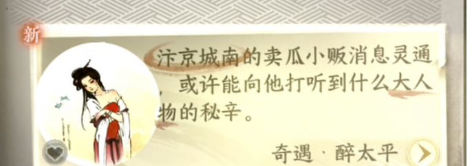 3)大吉奇遇【春山笑】:汴京(1021,934)对着NPC使用动作【开心鼓掌】可以触发奇遇,过程没难度,跟着指引走就行,就是剧情会长一点,可以获得12点剧情点。