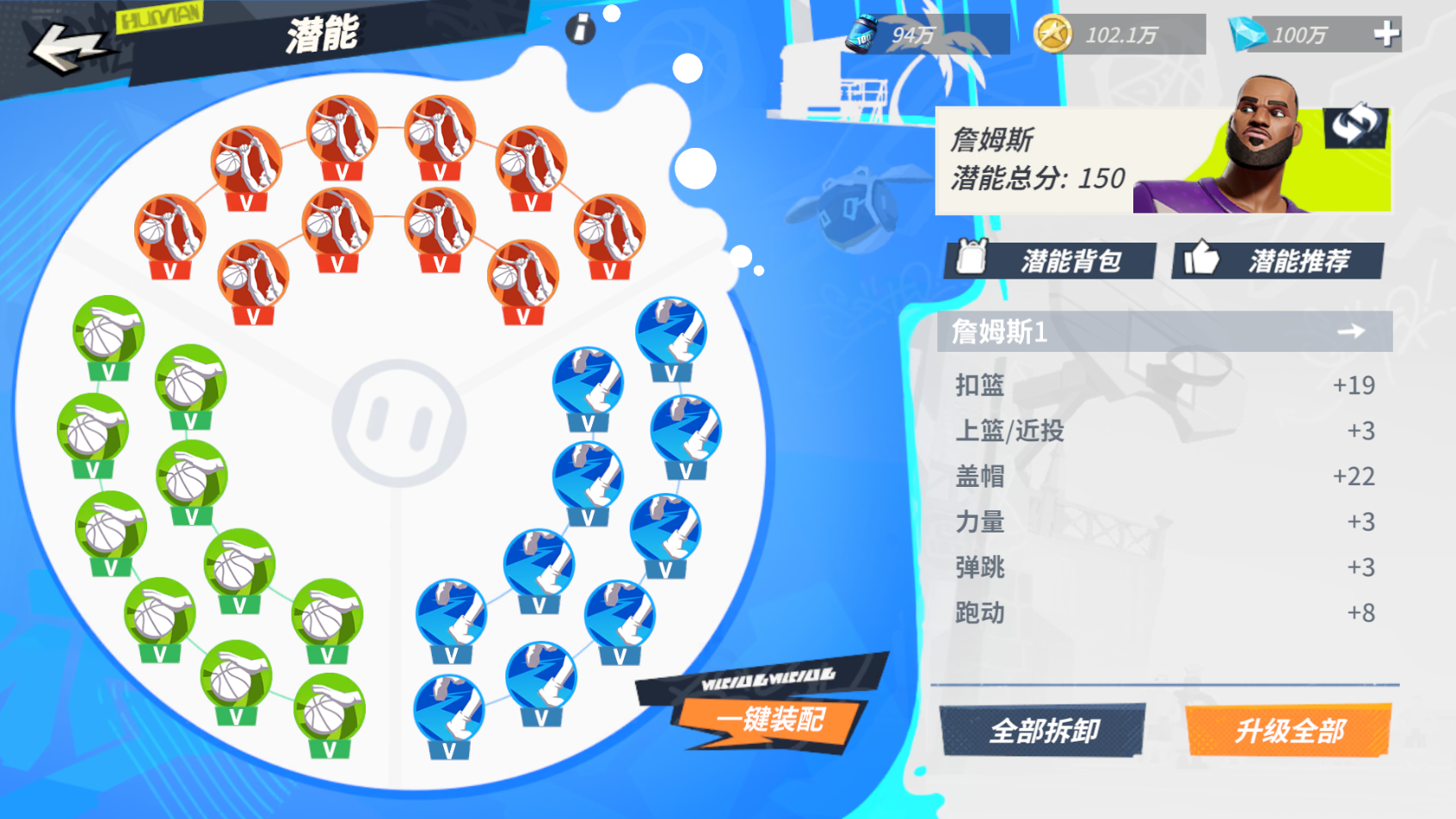 该潜能主要提升詹姆斯的盖帽能力,其次强化了扣篮能力,在提升球员防守能力的同时,也提高了禁区得分的能力。