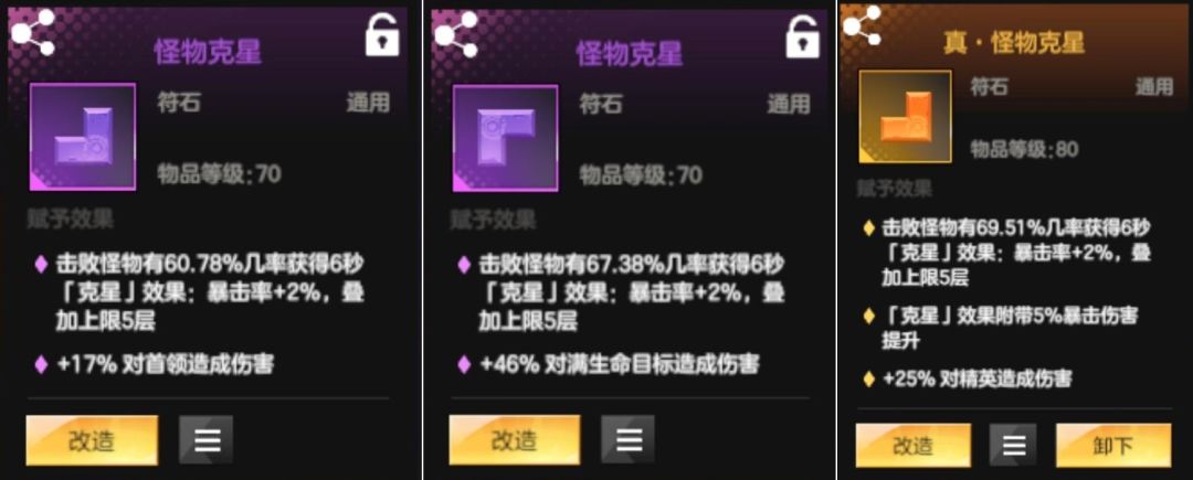 这个符石也很好用,首先自带一条属性:击败怪物有一定几率获得几秒的【克星】效果:增加暴击率,可叠加最多5层。真怪物克星则会进一步加强这个效果,附加暴击伤害。