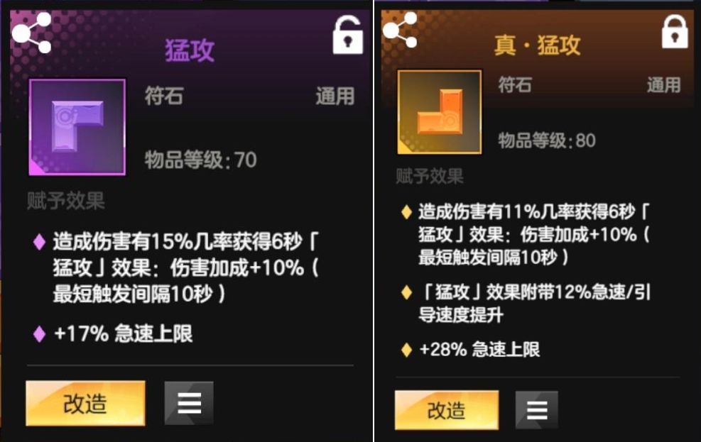猛攻的词条直接加伤害,而且随机词条不多:造成伤害有一定几率获得伤害加成,同时可以增加引导速度上限或者急速上限。真猛攻则是多一条直接提升引导速度或急速。