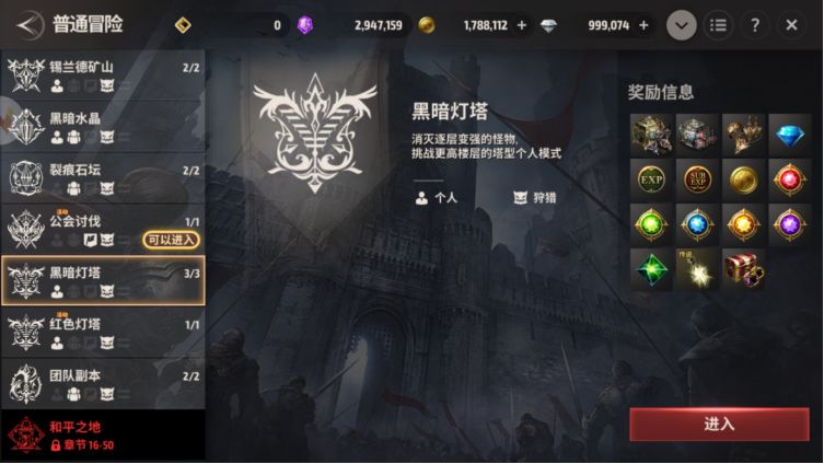 通过 [菜单] – [普通冒险] – [黑暗灯塔]界面可进入黑暗灯塔。