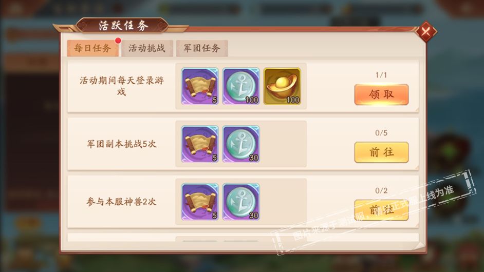 活动期间,少年们每日完成军团副本、神兽挑战、兵临城下、定军山、书楼争魁、巅峰竞技场、红颜出游等活跃任务均可获取航海图和银石锚币奖励;累计完成活动挑战和军团任务可获取司南、航海图、金玉锚币和银石锚币奖励。