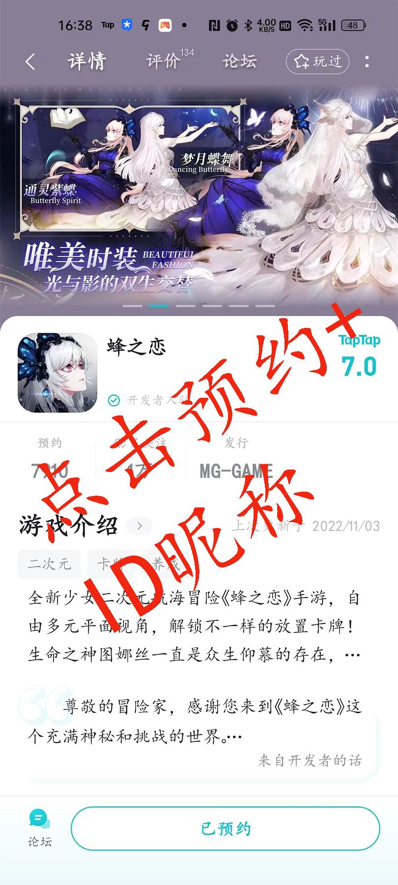 在TapTap 搜索《蜂之恋》预约后进行截图,在本帖下方发送你的预约截图回复。