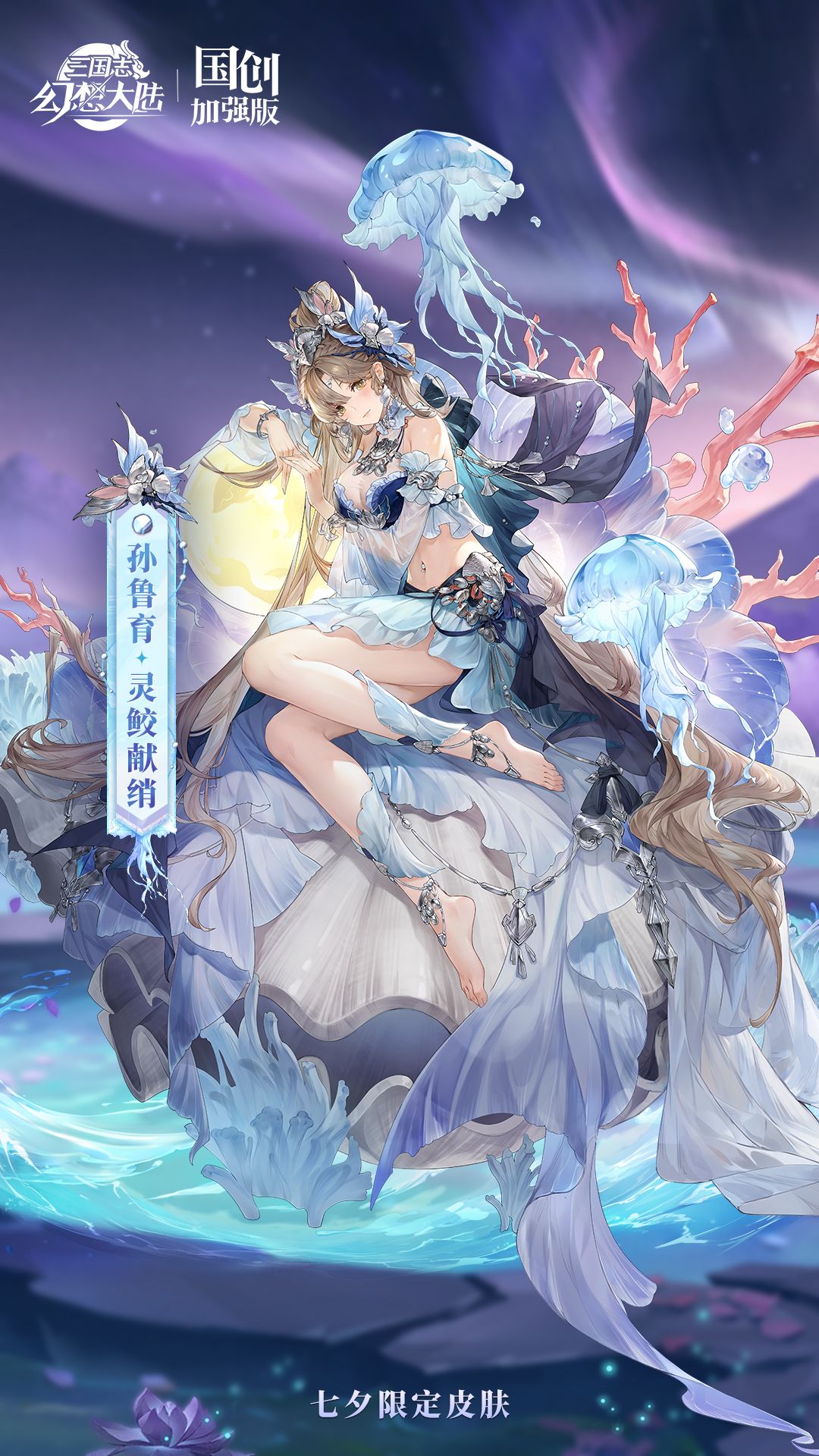 皮肤以水蓝色为主色调,以深海鲛人为设计灵感,采用龙绡、珍珠、贝壳、水母、珊瑚等元素来表现如梦似幻、唯美浪漫的海底氛围。作为江东二公主的孙鲁育身着一袭由珍贵龙绡制成的水蓝色鱼尾裙。镂空的腰间设计,附上轻纱也难掩其曼妙身材,腿部装饰与头部的珠花也是采用相同色系与剪裁,整体上凸显了孙鲁育娴静优雅的性格与善于纺织、心灵手巧的特点。