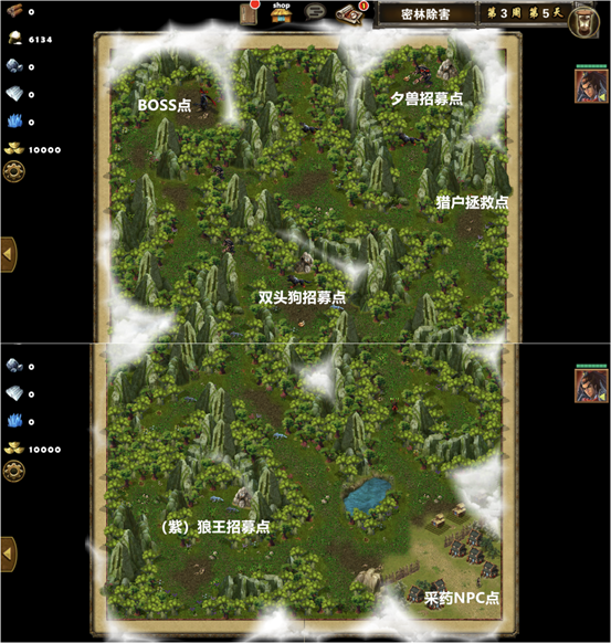 打BOSS最好要招募一些兵,地图上可招募的野怪都挺实用的,尤其是夕兽,能范围晕人2两回合,分兵后无限晕小怪,降低很多难度。狼至少要招一些,救了地图右上角的猎户还可以招紫狼王,打BOSS战,狼的协同攻击很不错,能清理boss的小分身。