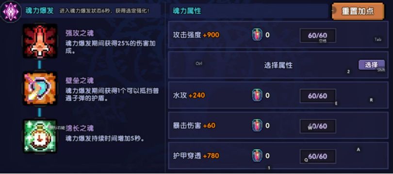 对于魂点不够用的同学,在满足穿透和暴击的前提下,各项属性平均分配点取,或者可根据自己面板来自己调整加点