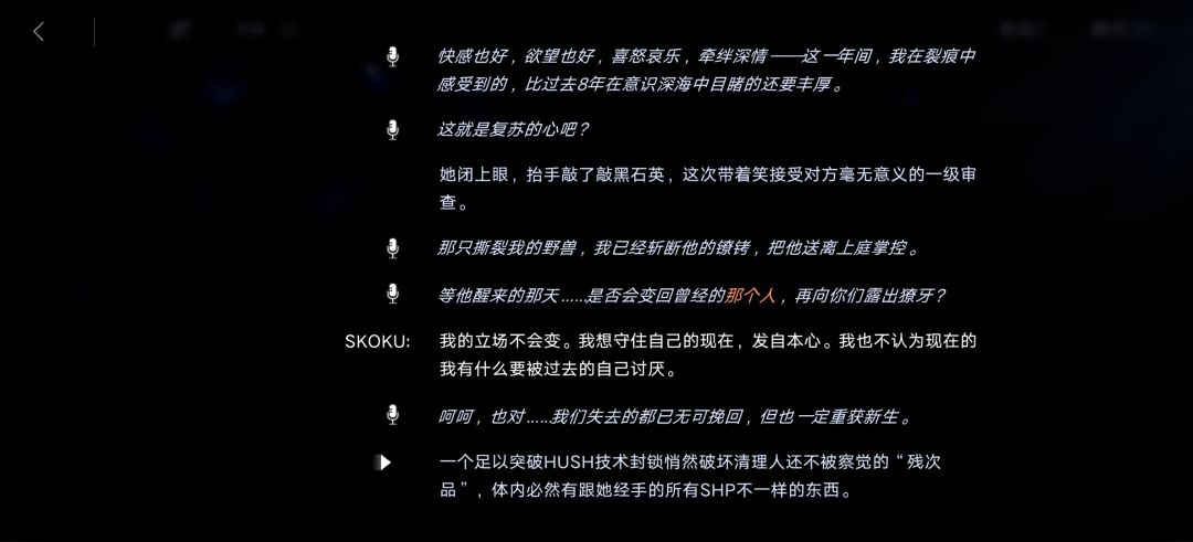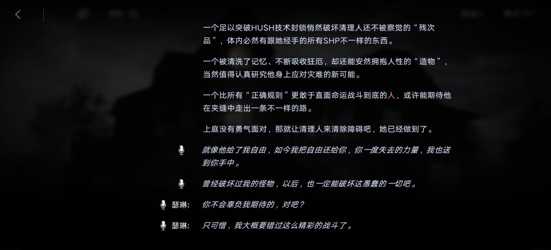2 瑟琳的内心独白:这部分交代了 瑟琳曾经是一个普通的禁闭者 因为反抗激烈 被上庭选中改造成清理人 日后在用能力安抚失忆前失控的局长时 被局长套上了枷锁 也使瑟琳被禁锢的感情解封 瑟琳开始重新思考自己 认为上庭的道路满是以理性之名掩饰的顽固和怯懦 对局长心怀感激的同时 视其为破坏上庭的最大希望