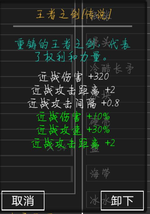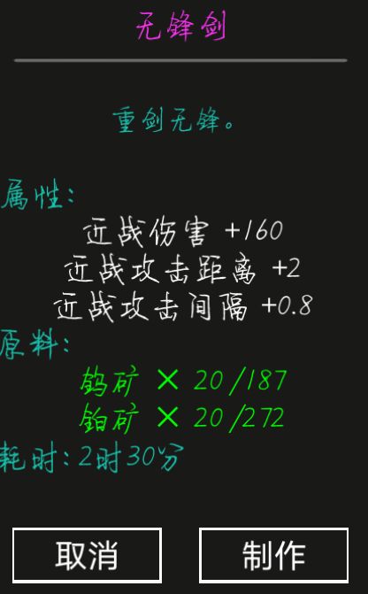 目标二:武器,护甲之后建议先做一把武器,个人感觉性价比最好的是无锋剑(攻速快,伤害高,距离远)(做了一把传说无锋剑过度献祭的时候忘了截图了),只需要很容易就得到的矿石就能做出来了,可以用死亡回档刷无锋剑的属性(近战武器属性最高是传说,远程武器属性最高是虚幻)
