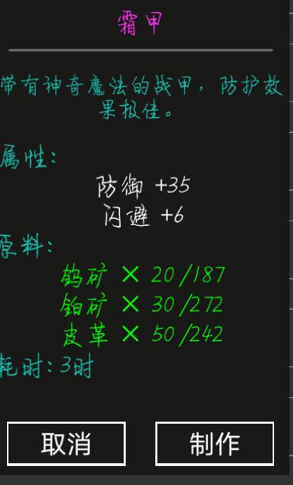 护甲:霜甲,鲨鱼甲矿石挖矿就有,鲨鱼鳍在海湾杀鲨鱼一次两个,蛛丝幽暗丛林杀蜘蛛