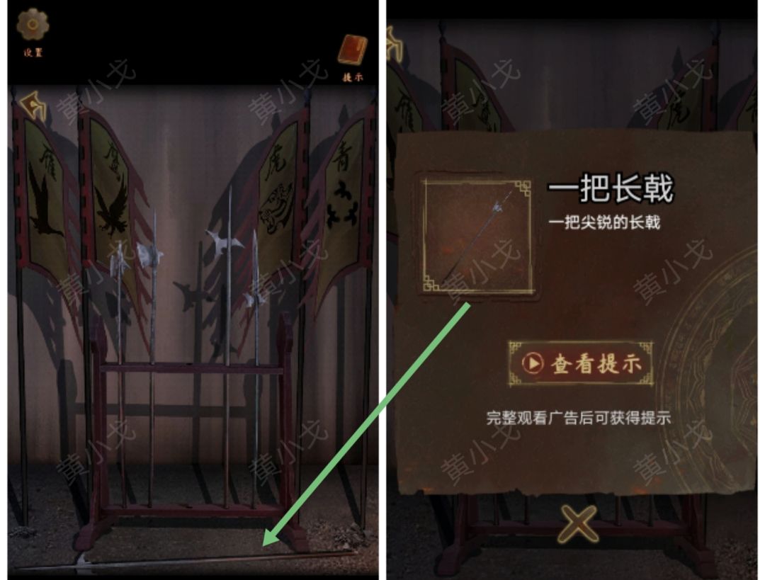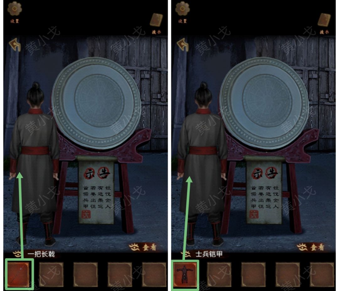 20.(营帐外)点击第一面鼓,拿【一把长戟】和【士兵铠甲】给士兵