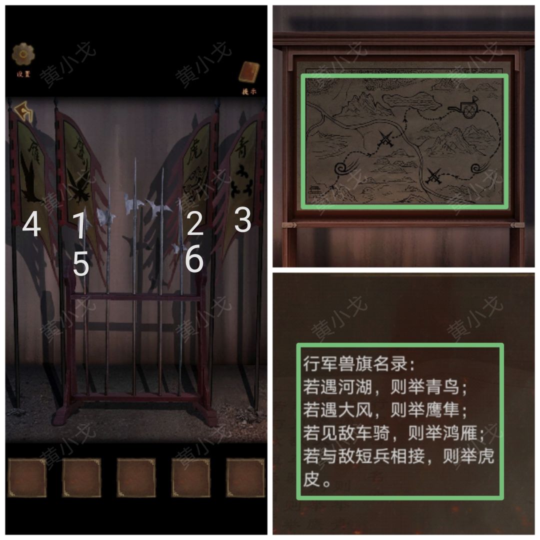 7.根据地图上的路线经过的地方(风、兵器、河、车骑、风、兵器)和书上的线索(遇河湖→举青鸟、遇大风→举鹰隼、遇见敌车骑→举鸿雁、与敌短兵相接→举虎皮),按(鹰虎青雁鹰虎)的顺序点击旗子