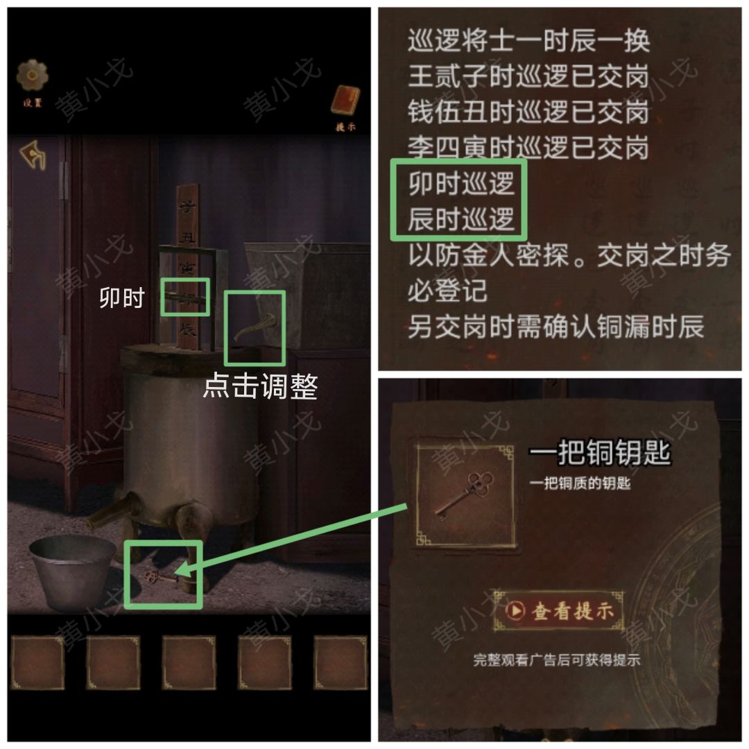 17.根据【巡夜告示】上的线索,把铜漏调整为卯时,钥匙点击,点击拾取,获得【一把铜钥匙】
