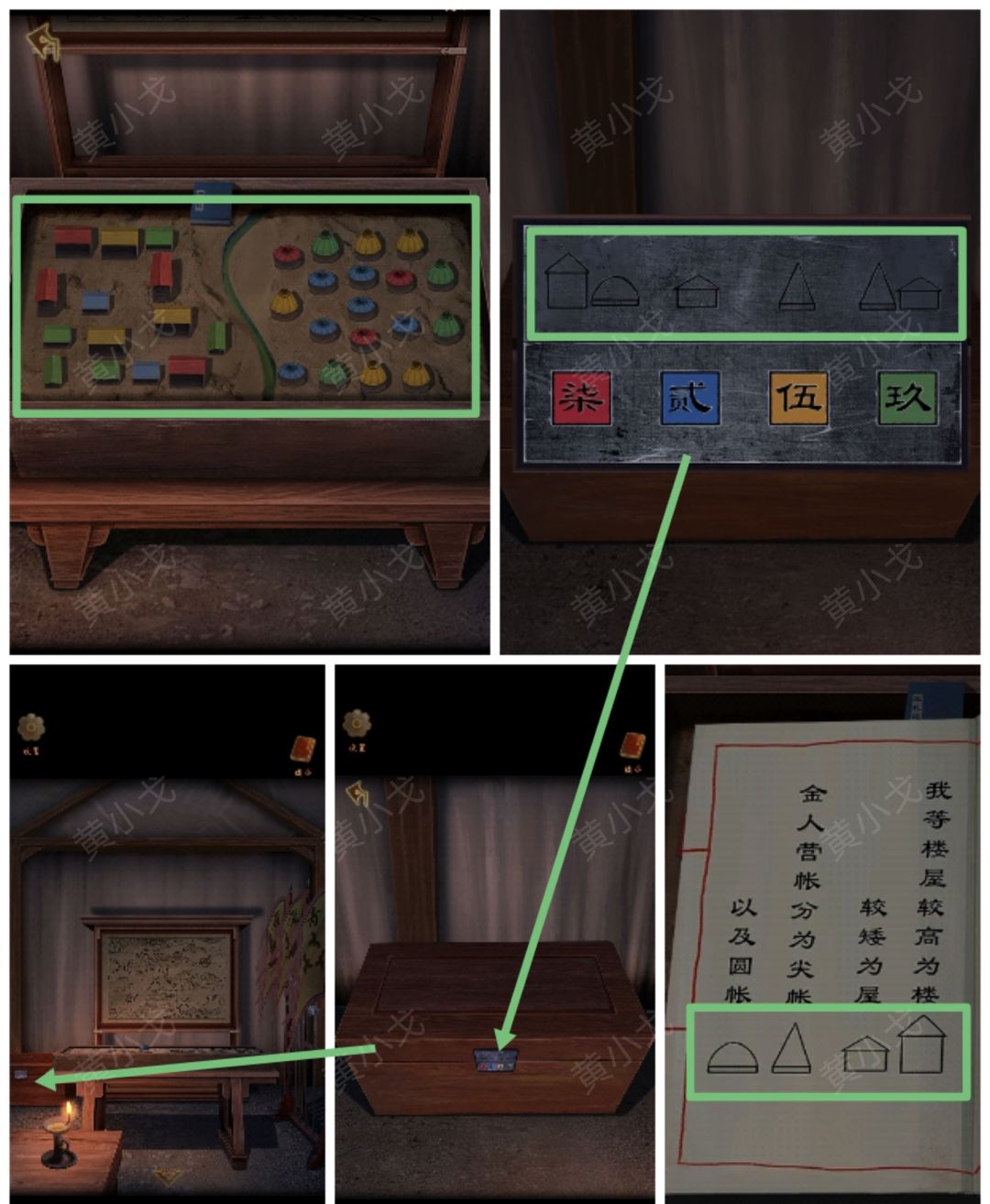 4.点击箱子上的密码锁,根据上面的图案和颜色(高楼➕圆帐-红色、矮楼-蓝色、尖帐-黄色、尖帐➕矮楼-绿色),结合书上的图案和沙盘上的营帐数(红色高楼-4、红色圆帐-3、蓝色矮楼-2、黄色尖帐-5、绿色尖帐-4、绿色矮楼-5),输入密码:7259