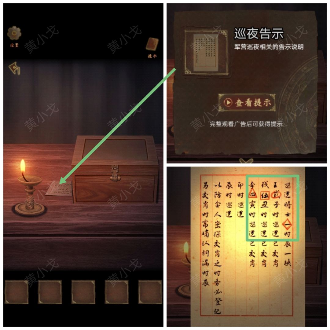 10.在盒子下面获得【巡夜告示】,对着灯光拿出【巡夜告示】,获得线索(图形及里面的数:三角形-四、正方形-伍、圆形-贰、菱形-一)