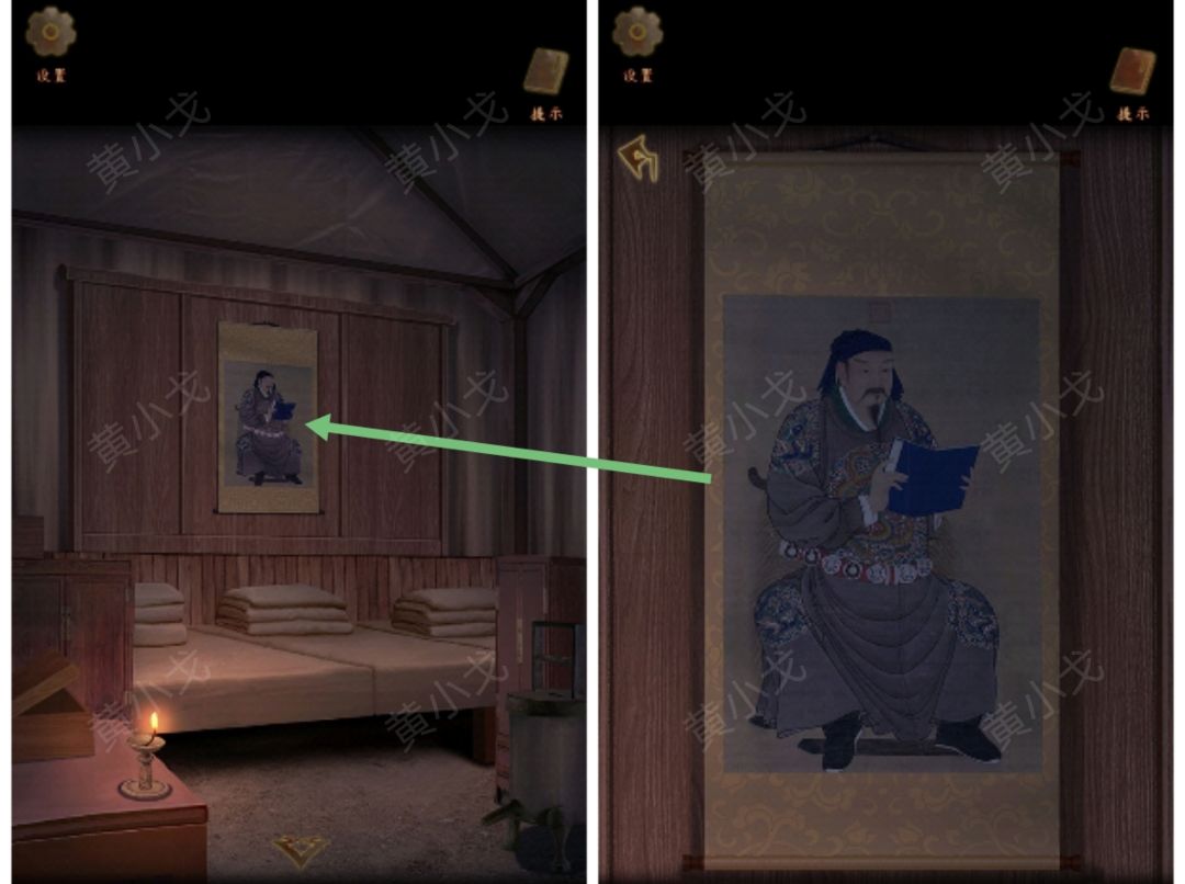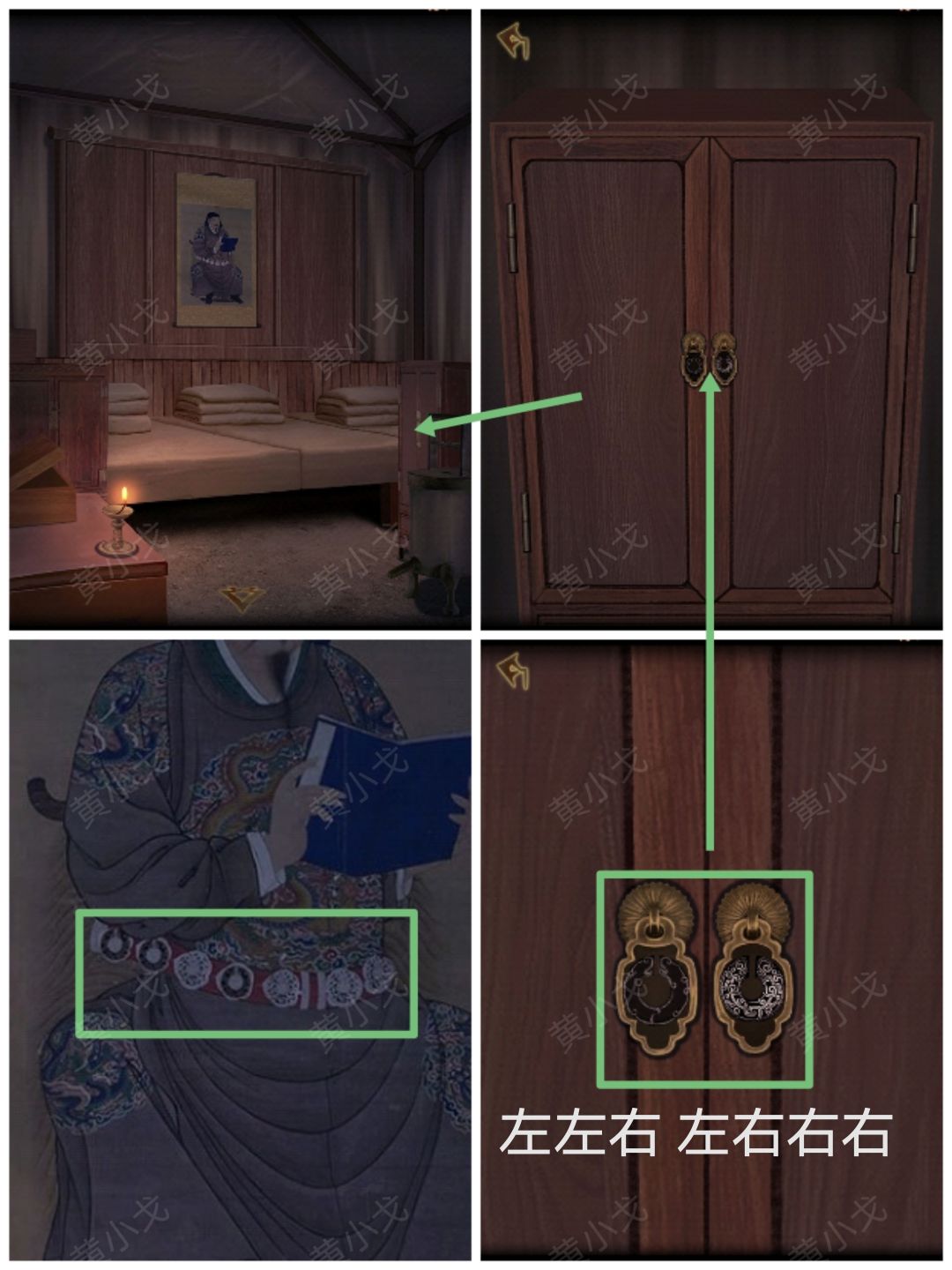 14.点击右边柜子上的把手,根据把手的花纹,结合画上岳将军腰上花纹的顺序,按(左左右左右右右)的顺序点击把手