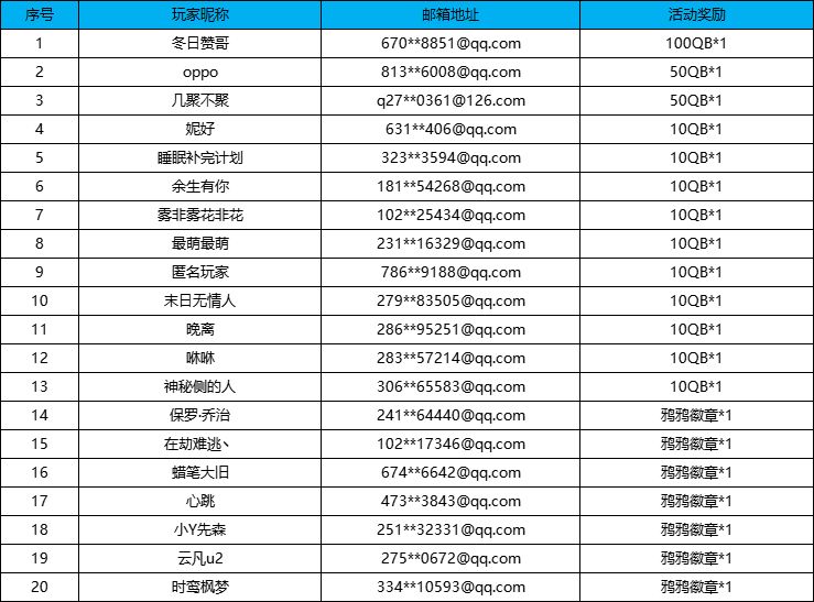 PS:若不同平台出现同一玩家获得奖励的情况,则根据该作品能获得的最高奖励判定平台获奖名额归属,不可跨平台获多个奖项。奖励在45个工作日内发放,奖励鸦鸦会通过邮件的方式发放,还请大家多多关注邮箱信息,及时激活邮箱哦~