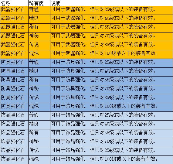 10级混沌单手剑为普通品质强化石,但 跨越5个品质使用混沌武器强化石(品质为100%),强化概率如下
